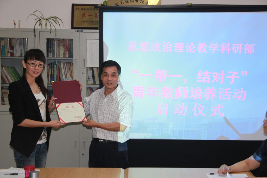 在帮教活动开幕仪式上,担任此次活动主持的思政部办公室主任王辉面向参加活动的全体教师首先宣讲了《思想政治理论教学科研部2013年“一帮一,结对子”青年教师培养活动方案》。接着,高凤香部长向担任指导教师的德育教研室主任李颂辉副教授颁发了导师聘书,并宣布:思政部2013青年教师培养工程正式启动。