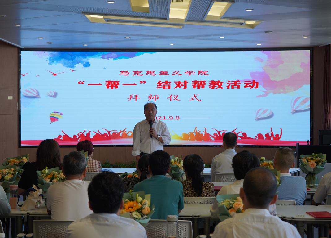 9月8日下午,在第37届教师节即将到来之际,马克思主义学院借此机会,于VR智慧思政实训中心组织开展了“一帮一”结对帮教活动暨青年教师拜师仪式。学校副院长梅创社,宣传部部长、马院院长王金辉、马院副院长王辉及全体马院教师参加了本次活动。