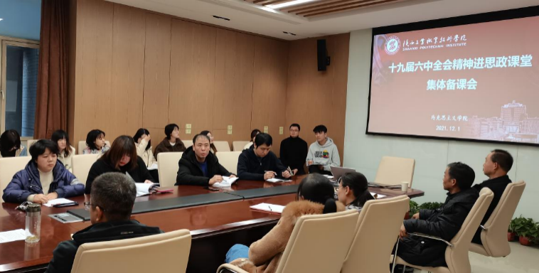 为进一步深入学习贯彻党的十九届六中全会精神,推动全会精神融入课堂教学,12月1日下午,马克思主义学院在会议室组织召开了十九届六中全会精神进课堂专题集体备课会。会议由王辉副院长主持,马院全体思政课教师参加。
