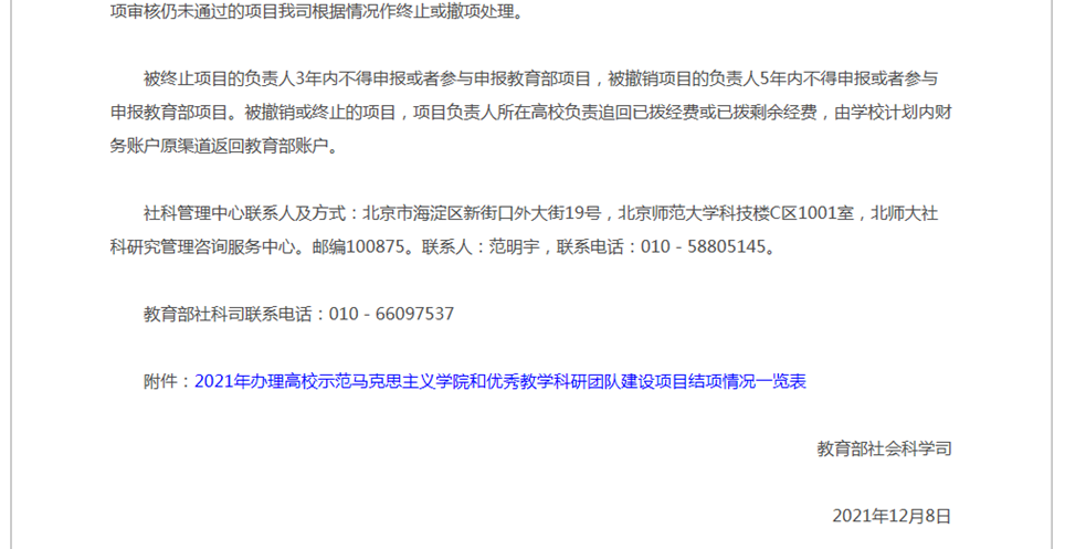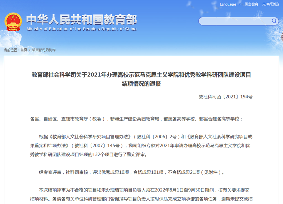 根据教育部社科司结题《通报》显示,本轮评审共对2021年申请办理结项的132个项目进行了鉴评,评出优秀成果10项,合格成果101项,不合格成果21项。