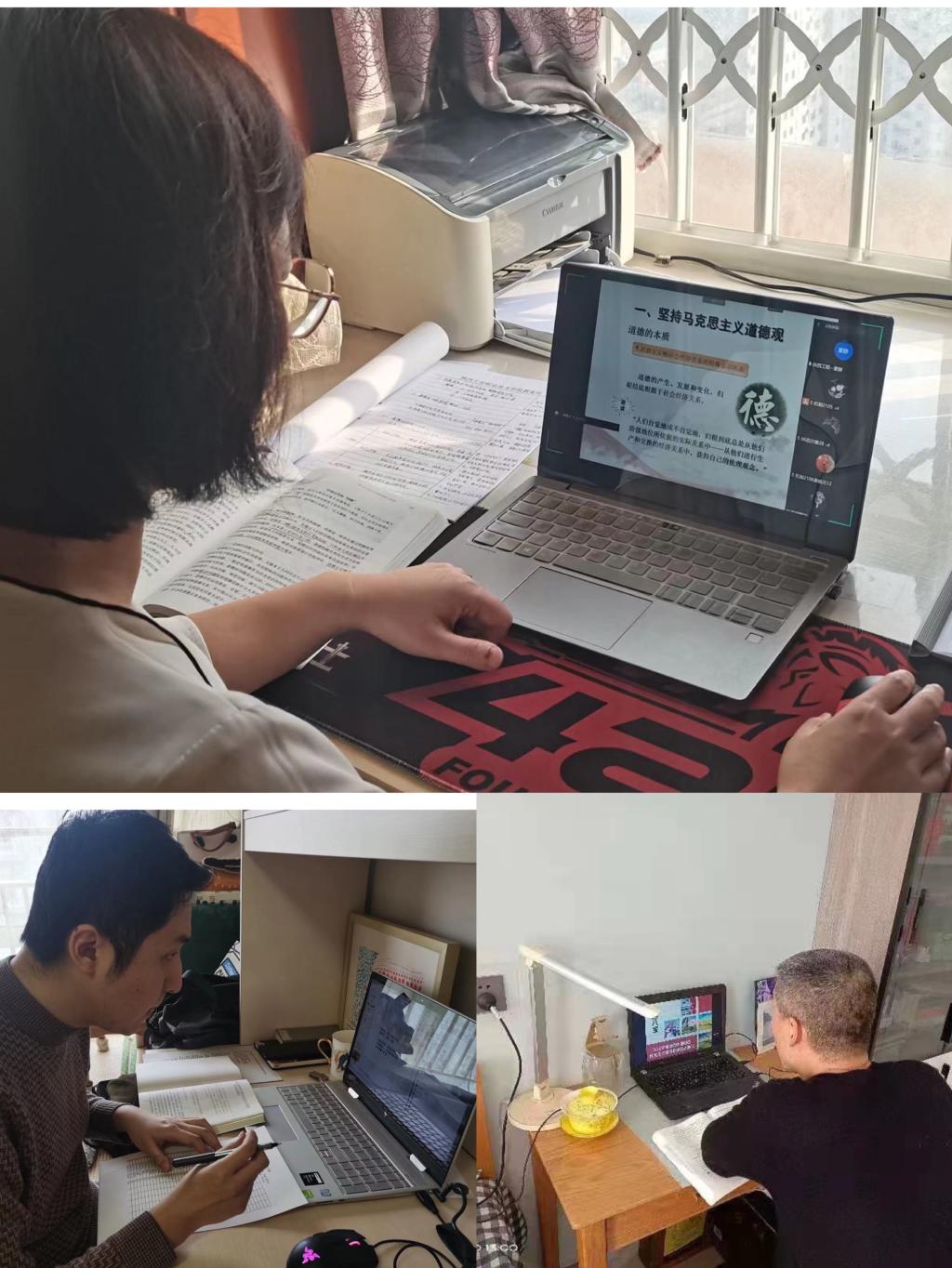 课堂上,思政课教师们化身“主播”,在严格执行授课计划开展讲授的同时,积极将“战疫”元素融入课堂,以事实为依据、以价值引导为目标、以理论阐释为武器,引导学生更加坚定在党的领导下打赢疫情防控人民战争、总体战、阻击战的信心和决心,增强“四个自信”。课下通过班级教学微信群积极开展互动,立足思政课角度与学生谈心,为学生传道受业、排忧解难。教学过程中,马院教学管理人员对线上教学进行了督导。