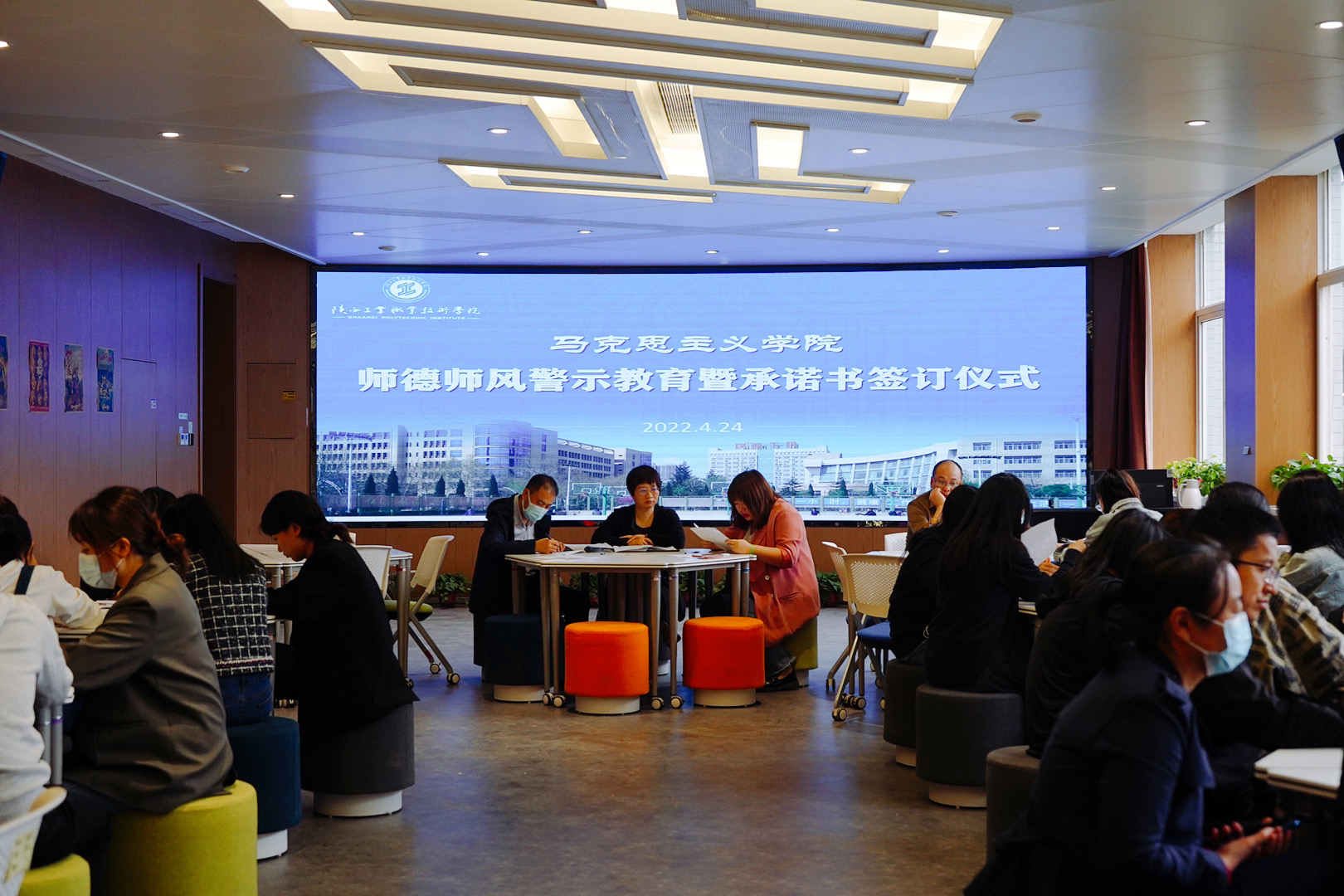 为认真落实《教育部关于建立健全高校师德建设长效机制的意见》《中共中央国务院关于全面深化新时代教师队伍建设改革的意见》《新时代高校教师职业行为十项准则》等文件精神,按照学校党委教师工作部安排,4月24日下午,马克思主义学院党总支在崇文楼A座309VR智慧思政实训中心组织全体教师开展师德师风警示教育大会暨承诺书签订仪式。活动由马院党总支副书记、副院长王艳主持。
