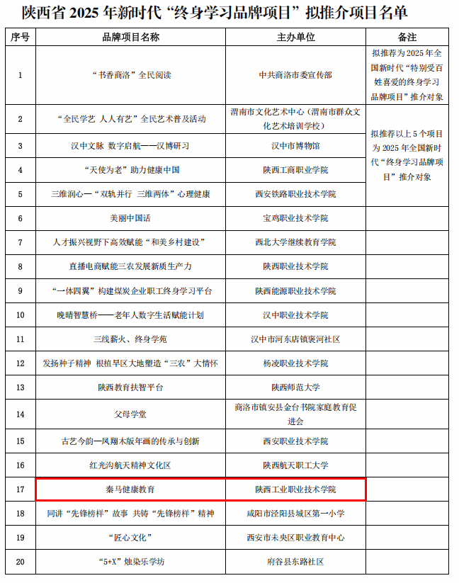 近日,根据中国成人教育协会《关于做好2025年新时代“百姓学习之星”和“终身学习品牌项目”宣传推介工作的通知》(中成协〔2025〕4号)要求,陕西省教育厅公布了2025年新时代“百姓学习之星”和“终身学习品牌项目”推介名单,我校马克思主义学院报送的“秦马健康教育”项目成功入选陕西省2025年新时代“终身学习品牌项目”。